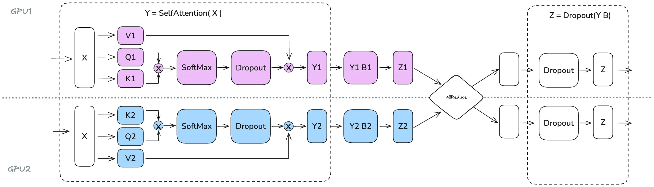 在这种设计下,MLP 整个过程只需要在最后一步进行一次同步通信(All-Reduce),效率非常高。