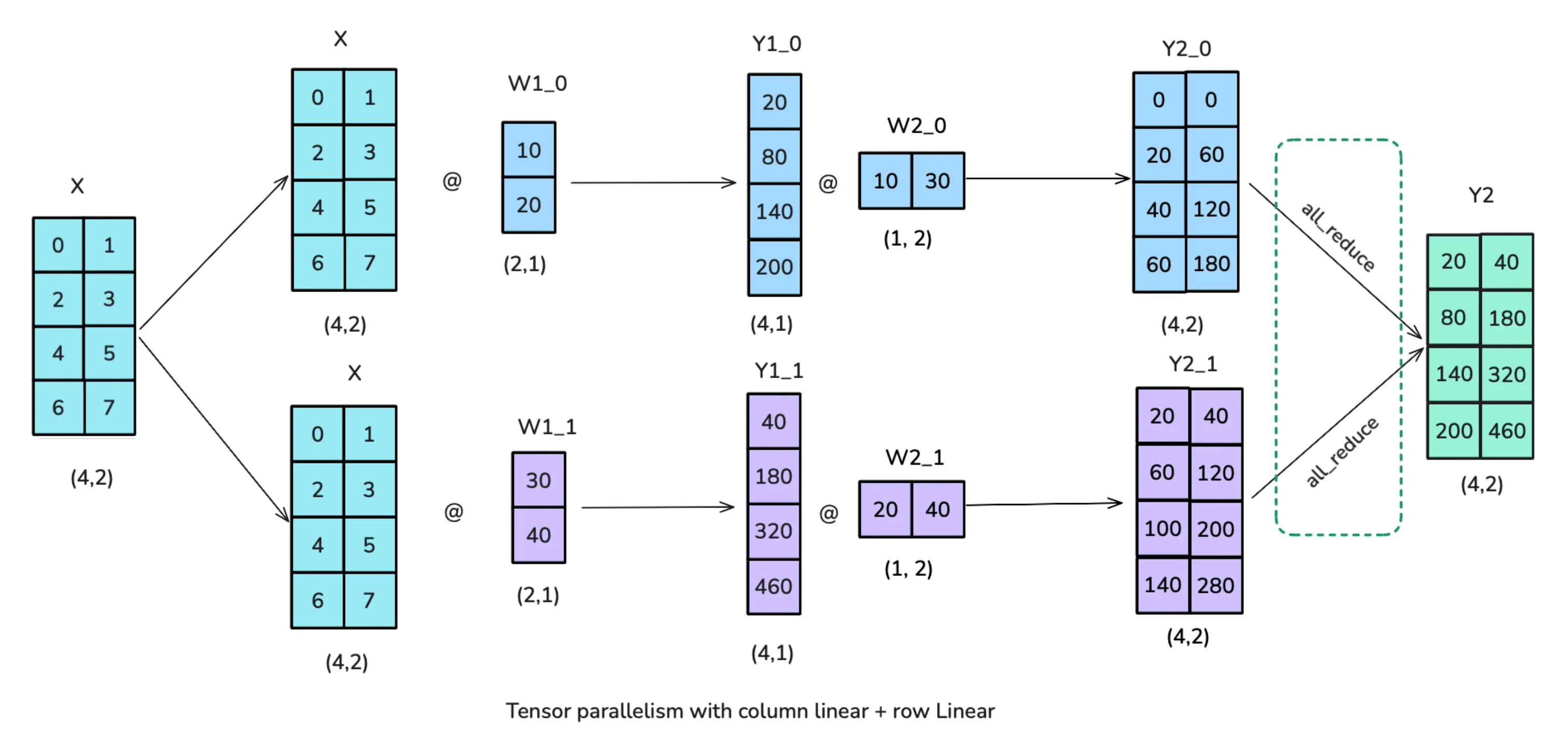 张量并行的概念非常简单,在线性代数中,矩阵乘法是可以进行分块的: