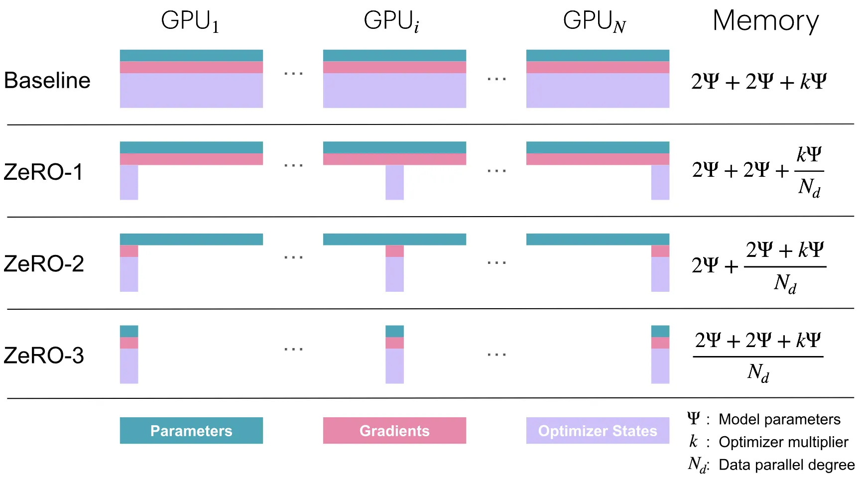 | ZeRO-1 | 低 | 完整模型参数 + 完整梯度 + 1/N 优化器状态 | Reduce-Scatter+All-Gather ($2\Psi$) |
