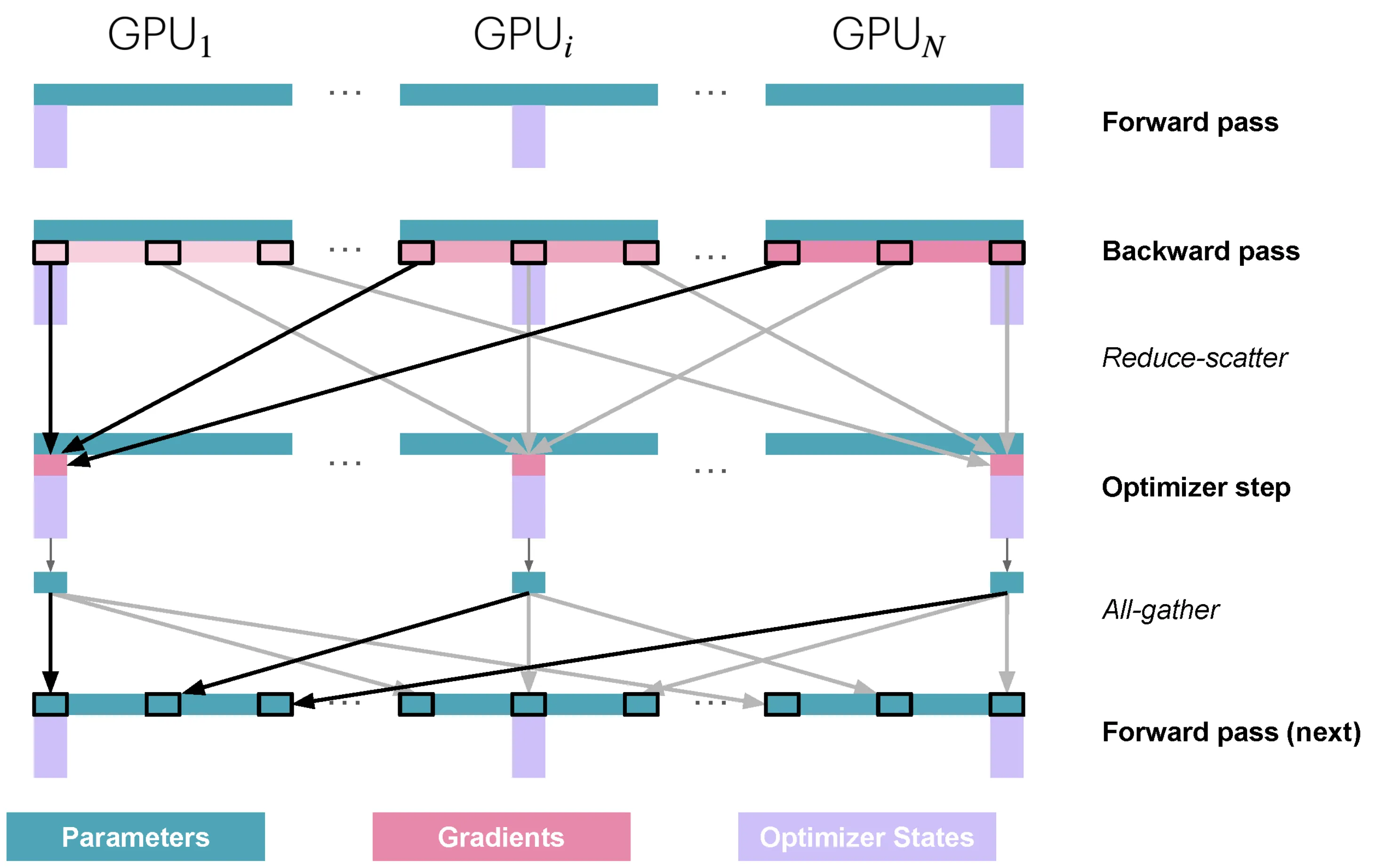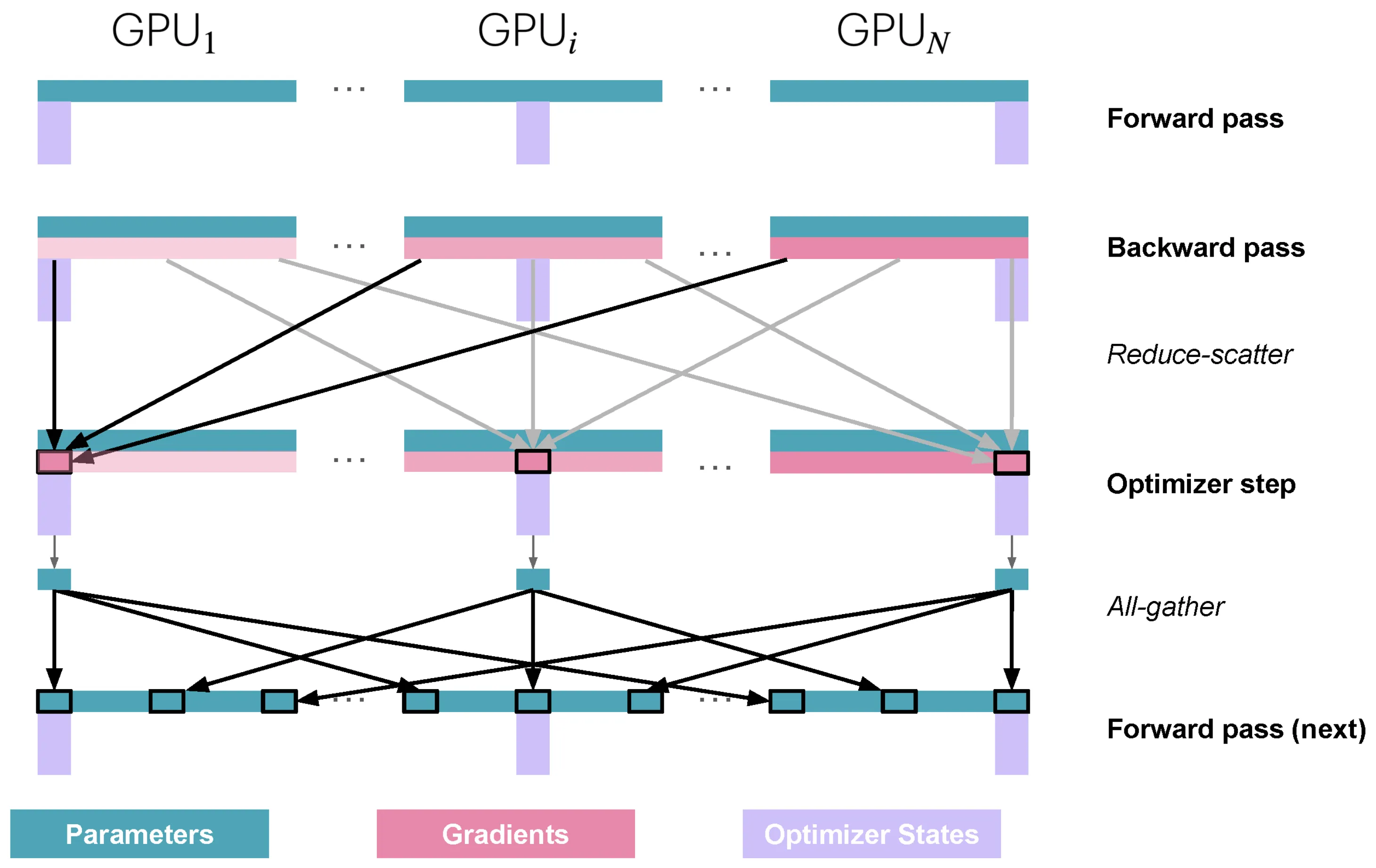 $$ \overbrace{\mathrm{Parameter}\to\mathrm{Loss}\to}^{需完整参数}\underbrace{\mathrm{Gradient}\to\mathrm{Optimizer}\to\mathrm{Parameter}'}_{可分片独立运行}\overbrace{\to\mathrm{Loss}'\to\cdots}^{需完整参数} $$