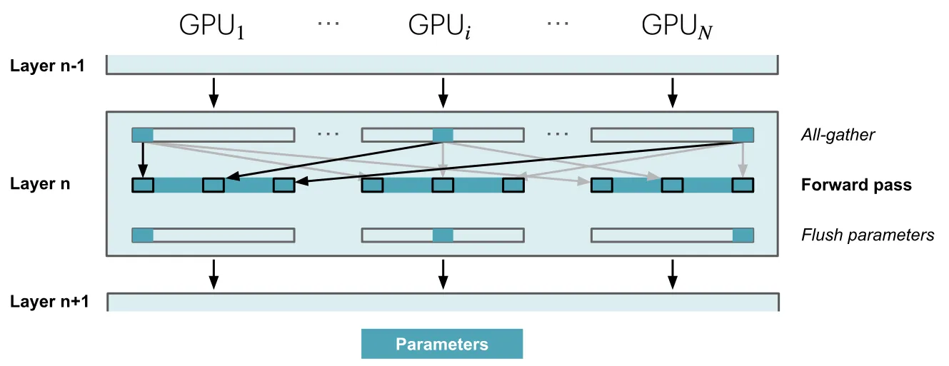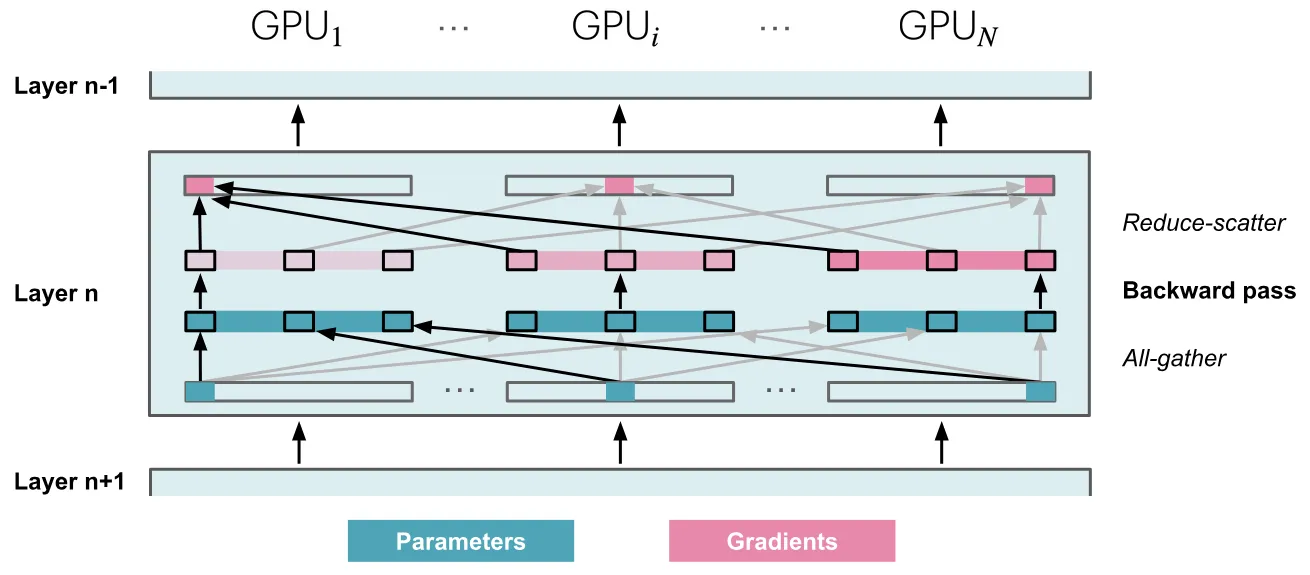 - 对于模型每一层,先用 All-Gather 收集分片模型参数得到完整模型参数,反向传播得到完整梯度值;