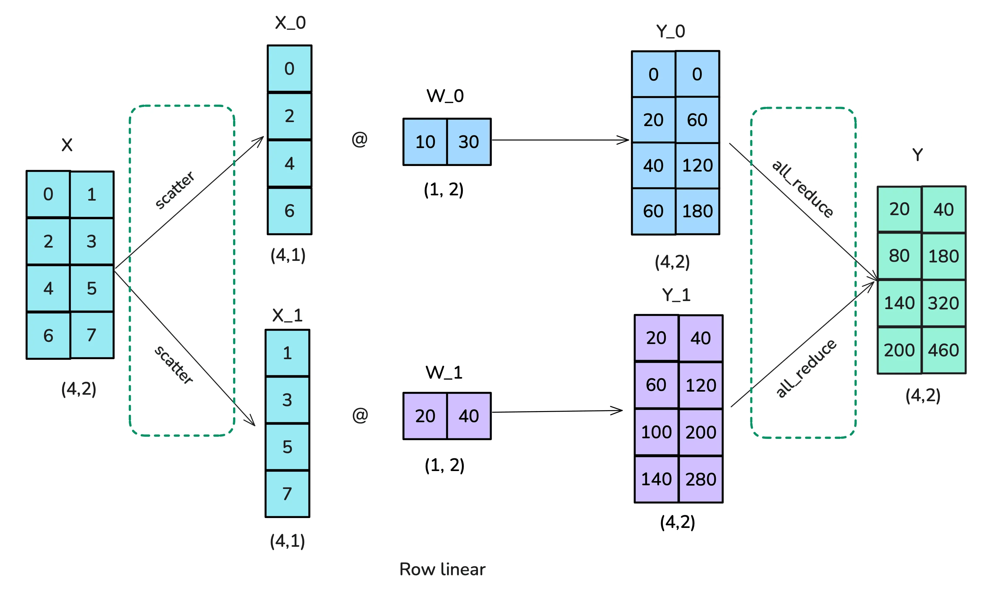 $$ Y = [X_0, X_1] \begin{bmatrix} W_0 \\ W_1 \end{bmatrix} = X_0 W_0 + X_1 W_1 = Y_0 + Y_1 $$